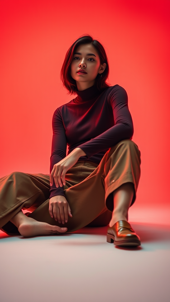 A cinematic fashion photograph for the brand Uniqlo featuring a woman seated gracefully on the floor. She is dressed in a Uniqlo Heattech top paired with stylish brown chinos. The composition is captured from a wide, low angle, enhancing the dramatic effect of the scene. The backdrop is a vibrant gradient blend of red, pink, and orange hues, creating a warm and inviting studio setting. The overall mood exudes modern elegance and sophistication, highlighting the versatility and functionality of Uniqlo's clothing line.