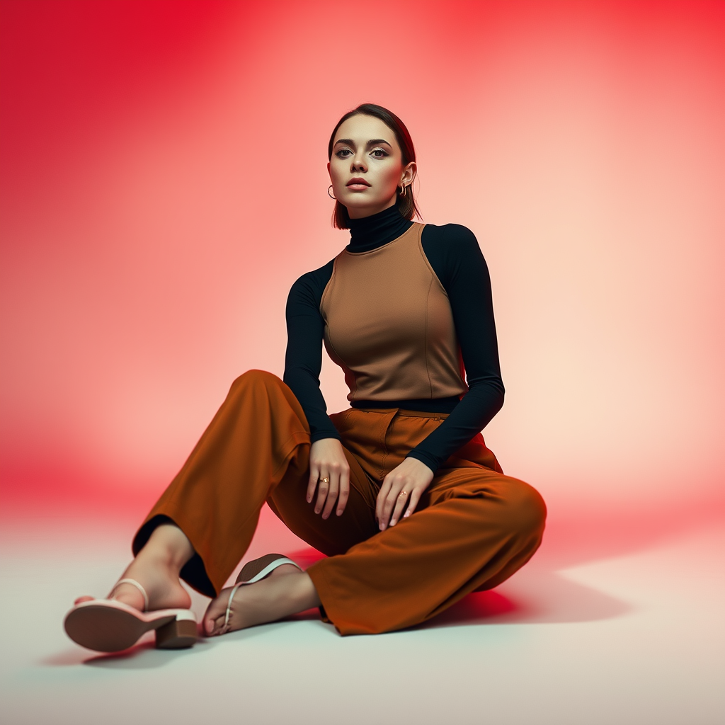A cinematic fashion photograph showcasing a woman sitting gracefully on the floor, wearing a sleek Uniqlo Heattech top paired with stylish brown chinos. The image is captured from a wide and low angle, emphasizing the modernity and comfort of the outfit. The background features a smooth gradient blend of vibrant red, soft pink, and warm orange hues, adding a dynamic and sophisticated atmosphere within the studio setting. The composition highlights the elegance and versatility of the ensemble while maintaining a chic and contemporary vibe.