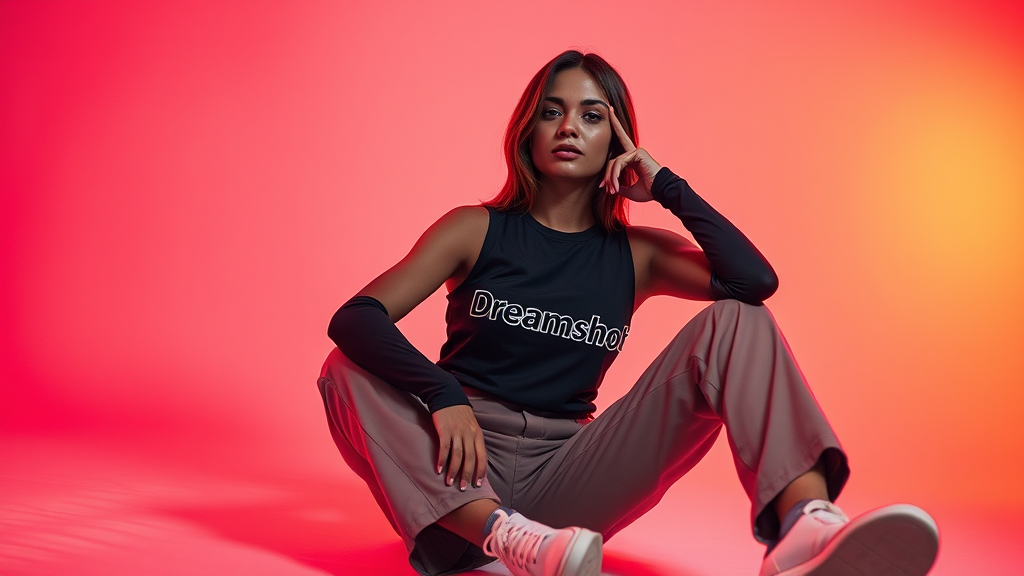 A cinematic fashion photography shot for the brand Dreamshot features a woman sitting confidently on the floor, captured from a wide, low angle. She is wearing a sleek Dreamshot heattech top adorned with bold "Dreamshot" logo text, paired with stylish taupe chinos. The studio background presents a vibrant gradient of deep red, warm pink, and glowing orange hues, creating a dynamic and energetic atmosphere. Her hair gently frames her face, and the lighting subtly highlights the texture of the clothing, emphasizing the modern and trendy essence of the brand.