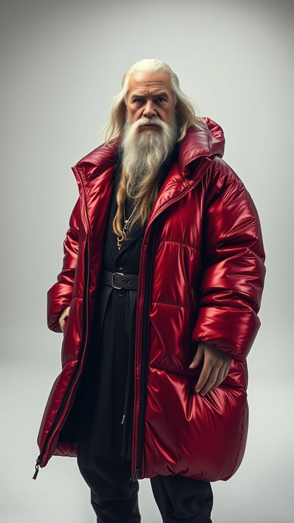 A cinematic fashion portrait capturing Gandalf in a well-lit studio, donning a metallic crimson inflatable oversized jacket designed collaboratively by Yeezy and Balenciaga. The focus is sharp and the lighting soft yet indirect, creating a glamourous, symmetrical composition akin to a Vogue editorial. The style is both intricate and clear, showcasing a full-body portrayal without imperfections, maintaining natural skin textures. This artistic representation avoids any anatomical anomalies or photographic errors, instead depicting a flawless and stylish vision of the legendary character, featured in an elegant and modern fashion context.