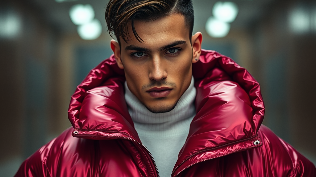 A cinematic fashion portrait of a strikingly handsome man clad in a metallic ruby inflatable oversized bubble puffer jacket, designed collaboratively by Yeezy and Balenciaga. The image is captured in sharp focus, showcasing intricate and balanced details. Soft, indirect lighting enhances the high-glamour and symmetrical composition, imbuing the scene with a sophisticated allure. This editorial-style shoot channels the essence of Vogue magazine aesthetics, presenting a modern and bold fashion statement.