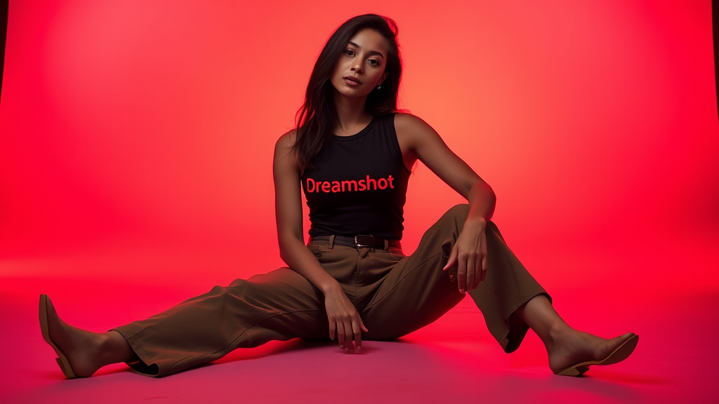 A cinematic fashion scene captures a woman seated gracefully on the floor, embodying modern elegance. She wears a sleek Dreamshot heattech top, showcasing the brand's bold "Dreamshot" logo in striking typography, perfectly paired with tailored brown chinos. The setting is a dynamic studio backdrop, a seamless gradient of red, pink, and orange hues, casting a warm and vivid ambiance. Her posture exudes confidence and style, reflecting a blend of contemporary fashion and artistic flair.