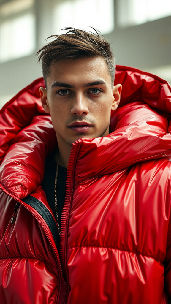 A cinematic fashion shoot featuring a striking portrait of an attractive man clad in a glossy metallic red oversized bubble puffer jacket with inflatable elements, a collaboration between Yeezy and Balenciaga. The scene is sharp and ultra-clear, showcasing intricate details under soft, diffuse lighting that enhances the glamorous and symmetrical composition. The atmosphere is akin to a high-end Vogue editorial, capturing the luxurious essence of a magazine cover shoot with a fashionable, modern edge.