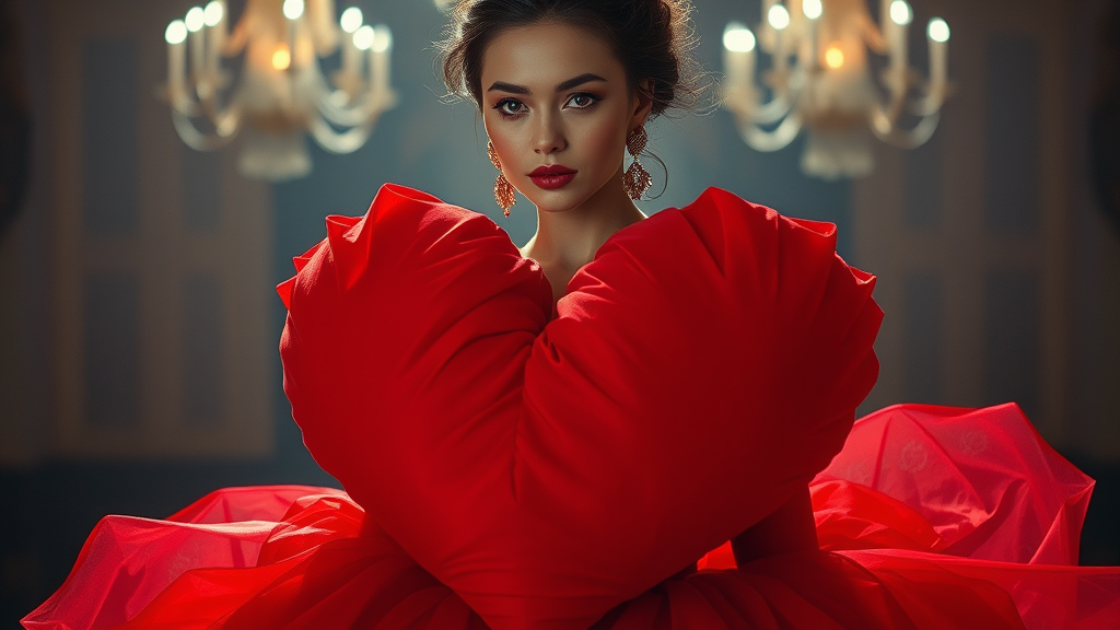 A cinematic fashion shoot featuring an extraordinarily beautiful woman in an oversized, plush red heart-shaped gown. The focus is sharp, capturing every intricate detail of the design and fabric. The setting is well-lit, creating a glamorous and symmetrical composition reminiscent of a high-fashion editorial spread. The atmosphere exudes elegance and sophistication, akin to a vogue magazine shoot, while subtle creative elements add a unique twist to the overall aesthetic.