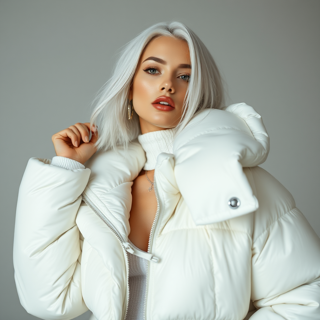 A cinematic fashion shoot portrait of an exceptionally beautiful woman with striking white hair, striking a dynamic pose. She is adorned in an oversized white puffer jacket from leading designers like Craig Green, Dingyun Zhang, Yeezy, Balenciaga, and Vetements. The scene is sharply focused, with a clear and detailed aesthetic that embodies glamour and symmetry. The styling is inspired by high-fashion editorials featured in Vogue, capturing a glossy, off-white palette that exudes a sophisticated magazine allure.