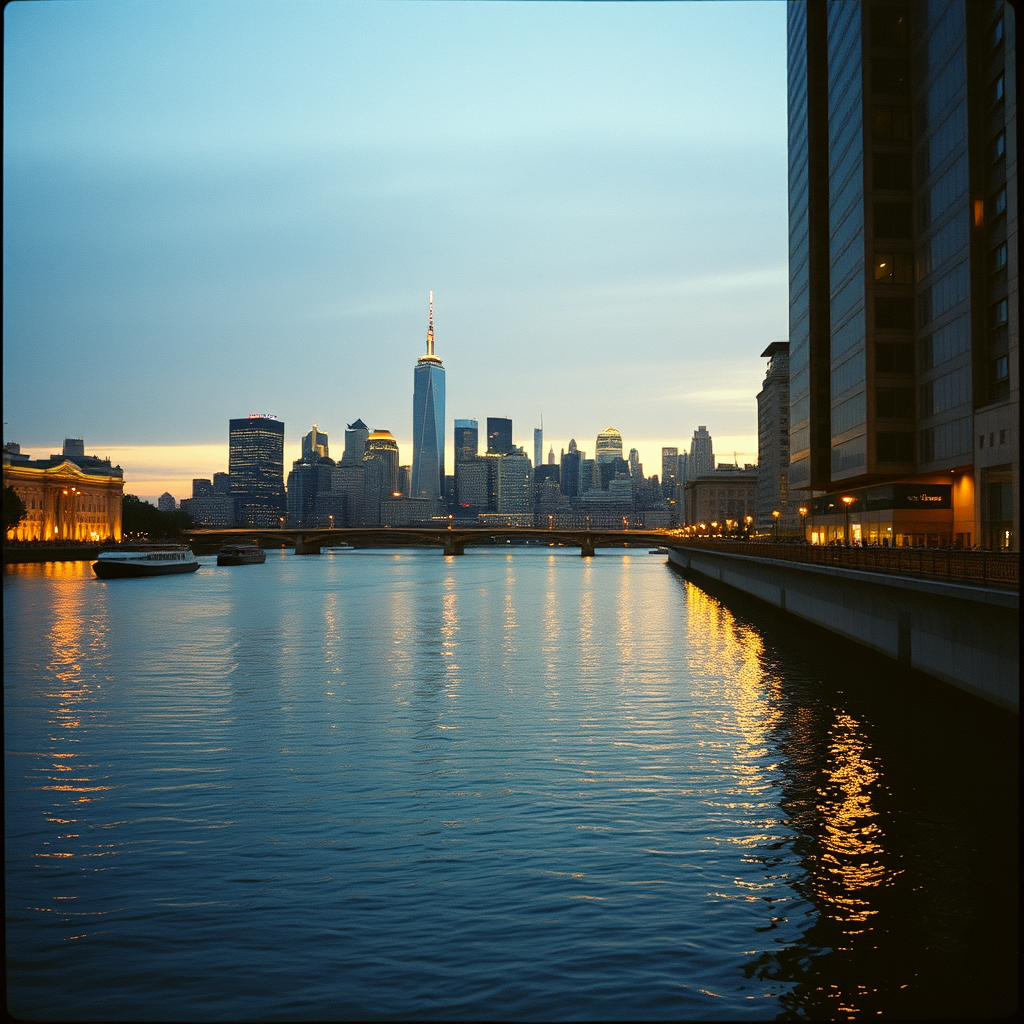 A cinematic film photo capturing an urban riverscape with the warm, nostalgic hues reminiscent of Kodak Portra, where the city skyline reflects elegantly in the calm waters at dusk, bathed in a gentle golden light that hints at stories untold, infused with subtle hints of contrast that evoke a sense of timeless tranquility.