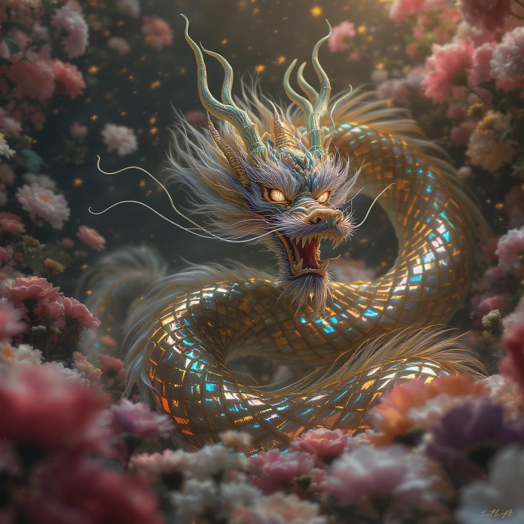 A cinematic film still depicting a Chinese dragon enveloped by a sea of vibrant flowers, its serpentine body elegantly coiling to form a mesmerizing composition. The dragon's skin glistens with intricate scales, shimmering in a spectrum of gorgeous hues. Majestic horns adorn its head, embodying the essence of a mythical creature with a traditional Chinese aesthetic. The scene features a shallow depth of field and a subtle vignette, capturing fine details with a high-budget flair. Bokeh effects highlight the dreamy quality, all within a moody, epic ambiance. The image carries a sense of beauty akin to film grain with a hint of anime and abstract art. While preserving the enchanting atmosphere and detailed animation style, the composition avoids distorted or low-quality attributes, maintaining visual cohesion without extraneous elements.