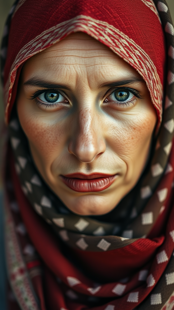 A cinematic full color portrait of a Bosnian woman wearing a keffiyeh, evoking epic character composition with influences from Ilya Kuvshinov, Terry Richardson, and Annie Leibovitz. The image captures sharp focus and natural lighting, enhanced by subtle subsurface scattering. Shot with an f2 aperture on a 35mm lens, the portrait exhibits a film grain texture that adds depth. Even though the composition is artistically renowned, it retains a candid, raw edge with a touch of atmospheric imperfection, offering an unexpected charm in its slightly gritty, unpolished quality.