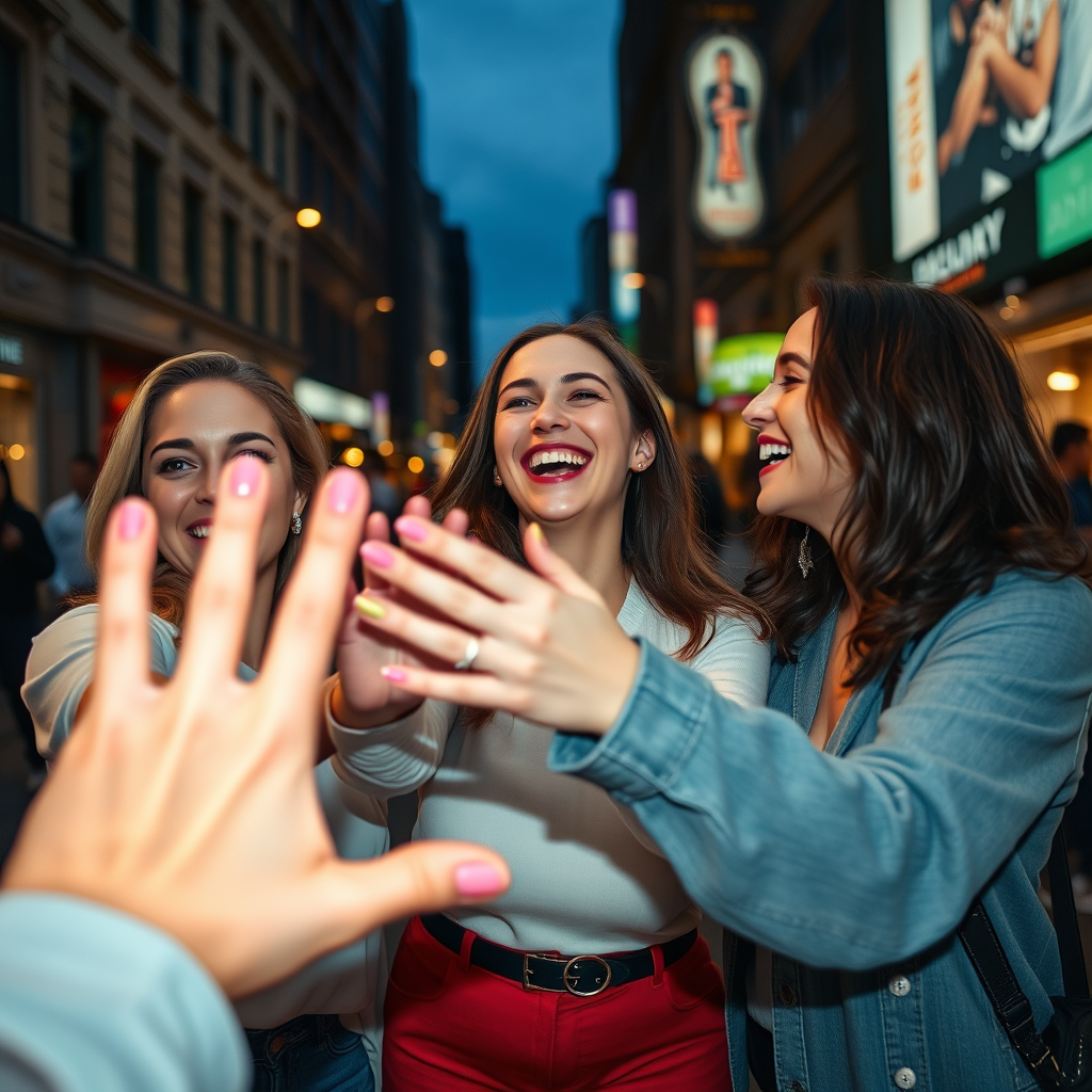 A cinematic image captures three women on a bustling downtown street, their hands playfully reaching towards the camera, laughter reflecting in their eyes as city lights twinkle in the evening air.