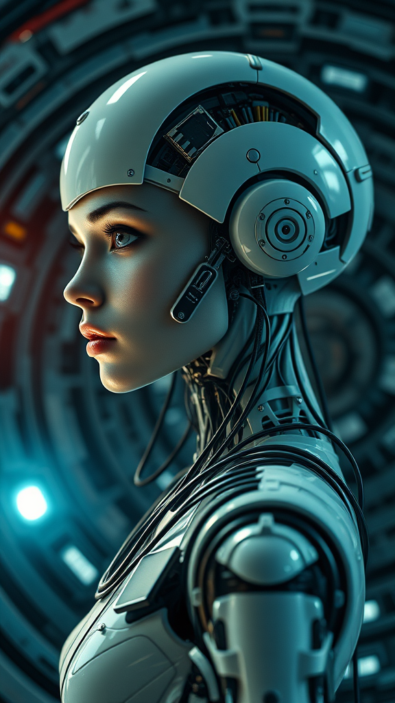 A cinematic image capturing a striking woman with a porcelain robot body, featuring a beautifully crafted android face. Her head, adorned with wires and porcelain elements, showcases detailed eyes, skin, and robotic components. Posed sideways, she's an elegant cyborg with many intricate robotic parts, wires, and microchips, set against a complex spaceship background. Rendered using Octane and Unreal Engine for highest quality, the scene is photorealistic and hyperrealistic, echoing model shoot aesthetics. God rays and lens flare enhance the atmosphere, with specular lighting and depth of field adding dimension. Shot with a Sony Alpha 1 and 85mm lens at f/1.4 GM, the image has a long exposure and hard focus for a cinematic film still effect, centered and symmetrical. UHD, HDR resolution delivers an impressive visual, inspired by the artistry of A Space Odyssey and creators like Stanley Kubrick and Geoffrey Unsworth, all while keeping the core theme of robotic elegance intact.