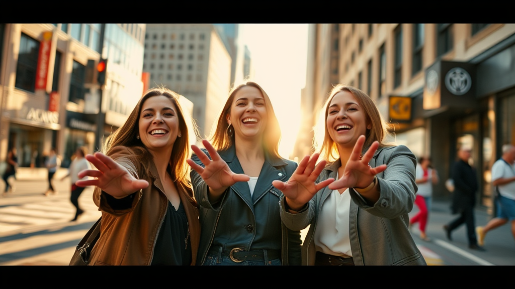 A cinematic image capturing a trio of women standing confidently on a bustling downtown street, their hands reaching playfully towards the camera. The sun casts a warm glow, creating dynamic shadows on the pavement. They are laughing, exuding a sense of joy and camaraderie, while the vibrant urban background blurs softly, highlighting their expressive faces.