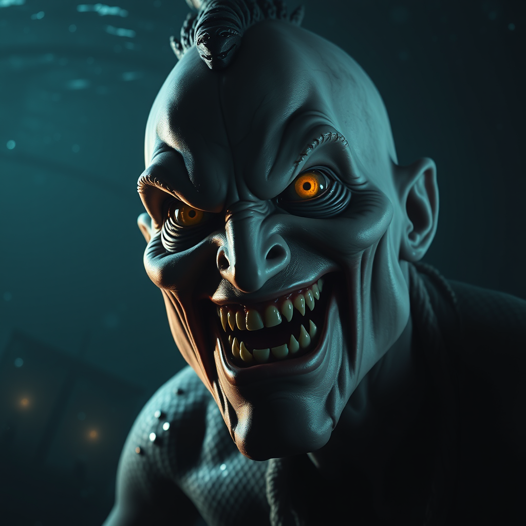 A cinematic image of a sinister merman with a maniacal grin, featuring piercing yellow eyes and a humanoid face, exuding an aura of mystery. His skin is a pale, human-like hue, contrasting with the melancholic atmosphere. The scene is illuminated by dynamic lighting that highlights the eerie features amid the shadowy depths of a dark underwater background, where the faint silhouettes of ancient shipwrecks add to the scene's haunting allure.