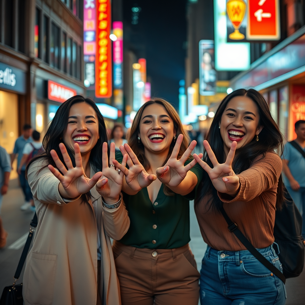 A cinematic image of three women standing on a bustling downtown street, their faces lit with excitement and laughter; they extend one hand each towards the camera, fingers playfully spread, capturing the energy of the city night lights gleaming behind them.