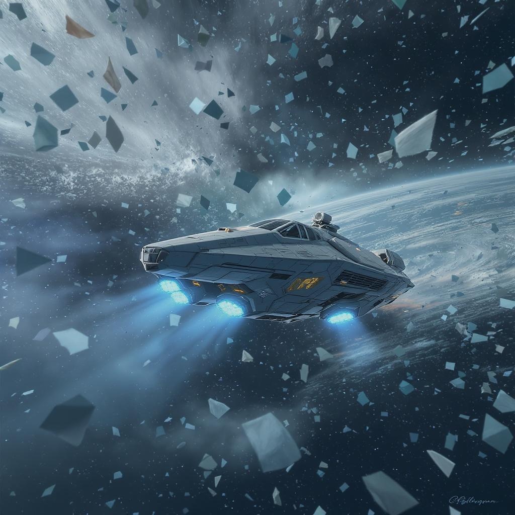A cinematic masterpiece depicting a stunning spacecraft in action, inspired by the epic scale of Star Wars and the nostalgic style of Olympus AF-1. The scene captures fragmented planes of light gray and dark emerald, merging with soft hues of light indigo and blue in a mesmerizing frostpunk atmosphere. The spacecraft glides into view, its hyper-realistic details shining in 32k UHD resolution, showcasing breathtaking craftsmanship. This digital art piece presents a realistic rendering, embodying the changelingcore aesthetic with an IMAX-level close-up. The light contrasts against the vastness of space, creating a visual experience that's awe-inspiring and beautiful beyond belief, truly a visionary masterpiece of science fiction artistry.