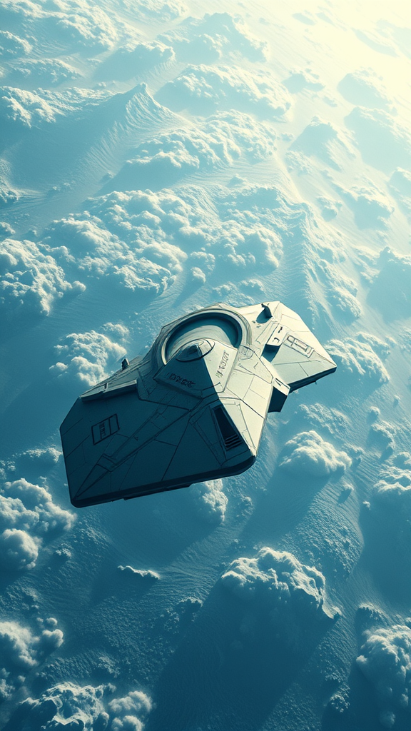 A cinematic masterpiece emerges as a spacecraft glides majestically into view against a backdrop of light indigo and white, reminiscent of iconic Star Wars visuals. The scene, captured in the style of an Olympus AF-1, exudes an air of awe with its hyper-realistic rendering and 32k UHD detail, showcasing fragmented planes in light gray and dark emerald hues. The ship's silhouette, skillfully blending realism with digital art, embodies a futuristic vibe akin to frostpunk aesthetic. As one marvels at this fusion of changelingcore and #vfxfriday influences, the intricate textures and sweeping IMAX-like perspective invite viewers into a science fiction realm that's almost tangible. A photo that defies belief, it stands as a testament to the beauty of spacecraft in motion, rendered with hyper-detailed precision.