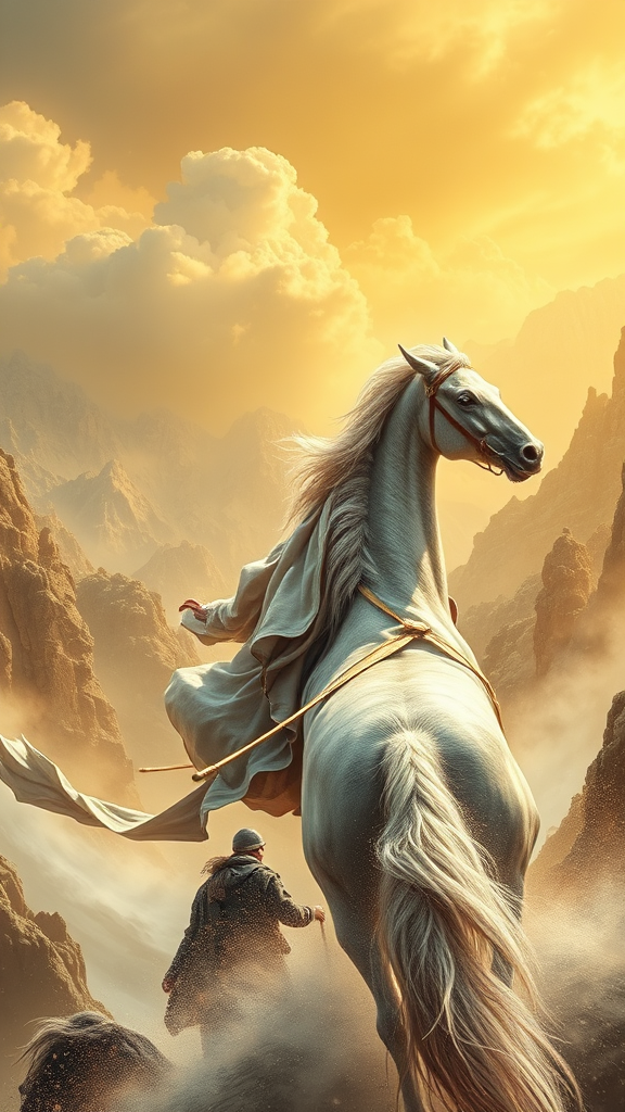 A cinematic montage of a horse rider traversing an epic landscape, inspired by the hyper-realistic details of John Howe, infused with the mythical elements of dragon art. The scene is reminiscent of Franciszek Starowieyski's style, blending Himalayan art influences with a palette dominated by yellow and white hues. The rider's flowing garments and the horse's mane ripple in the wind with intricate, lifelike textures, capturing a sense of movement and grandeur.