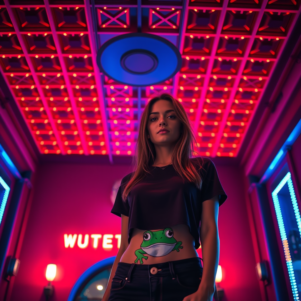 A cinematic, moody image showcases an attractive woman wearing a frog-themed cropped t-shirt, standing confidently in front of the iconic Watergate building. The ceiling is dramatically illuminated with intense red lights arranged in a captivating grid pattern, while subtle blue accents trace the walls and support beams, enhancing the nightlife vibe. Her stylish stance and the vibrant play of colors create an alluring and enigmatic atmosphere.