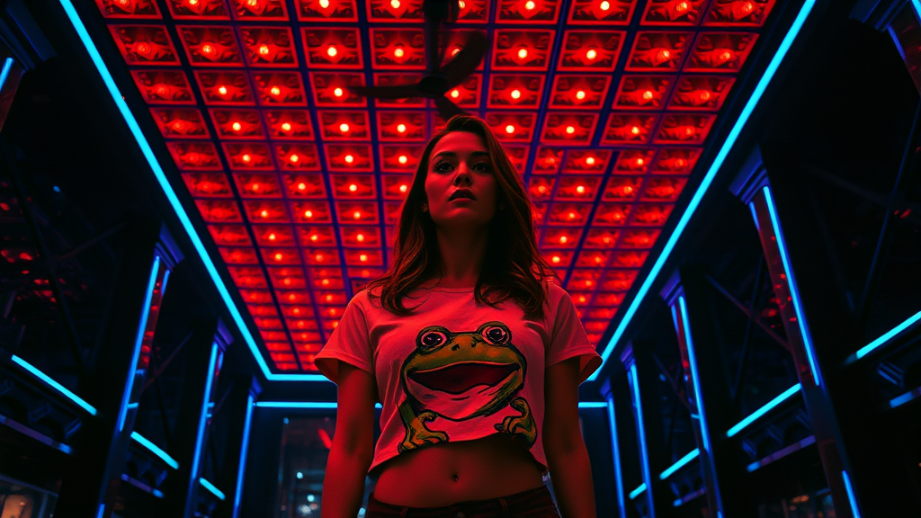 A cinematic, moody image shows an alluring woman wearing a cropped frog t-shirt, standing confidently in front of the iconic Watergate complex. The ceiling above her glows with intense red lights arranged in a mesmerizing grid pattern, while blue accents cascade along the walls and support beams, creating a captivating nightlife ambiance. The overall vibe is sleek and vibrant, with the woman's full figure perfectly illuminated against the dramatic backdrop.