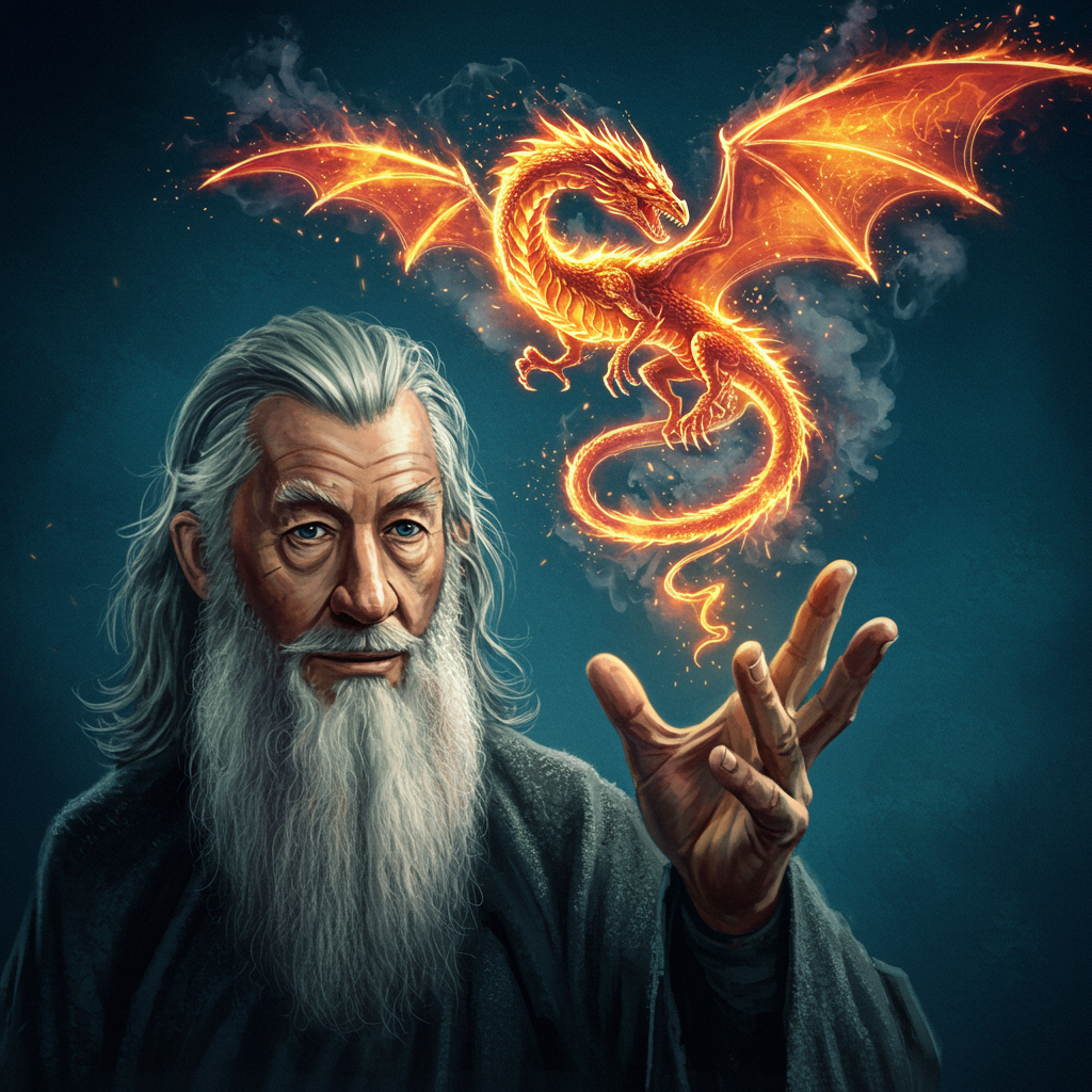 A cinematic painting captures Gandalf the Grey from the chest up, focusing intently on his wise and warm gaze as he looks directly at the viewer. A gentle smile hints in his eyes. His hand is raised, fingers slightly curled, conjuring an ethereal dragon made entirely of vibrant fireworks and smoke hovering just above his palm. The dragon is brilliant and detailed, crafted from swirling fire and wispy smoke, coiling gracefully in mid-air with scales flickering in deep orange, crimson, and gold. Its intense eyes and open jaws release sparkling embers, casting a warm, dynamic glow illuminating Gandalf's face and hand. Spires of smoke spiral from its wings and tail, blending into the dark blue background, enhancing its ghostly quality. Volumetric lighting accentuates Gandalf's hand and the dragon, creating depth as light reflects off magical dust particles. The dragon's smoky fire leaves shimmering trails like sparklers, adding movement and awe. The rendering is hyperrealistic and finely detailed, with an emphasis on soft shadows and diffused lighting. Gandalf's robes and hand bask in the dragon's warm glow, their textures enriched by contrasting light and shadow. The painting captures an enchanting moment of magic, showcasing the dragon's fiery form and smoke with lifelike precision, evoking a mystical and cinematic scene.