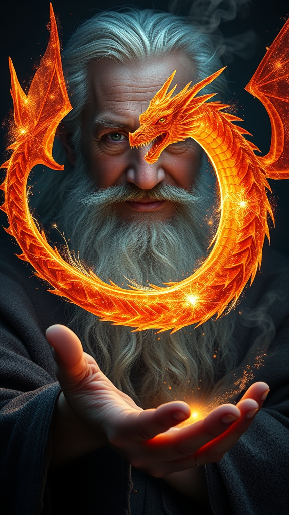 A cinematic painting of Gandalf the Grey, captured from the chest up with an intimate crop. He gazes directly at the viewer with a gentle smile, exuding wisdom and kindness. His hand is raised and open, fingers slightly curled as he conjures an ethereal, fiery dragon made of fireworks and smoke hovering above his palm. The dragon is intricately detailed, composed of vibrant, swirling fire and faint smoky wisps. It appears alive, gracefully coiling in mid-air, with scales flickering in shades of deep orange, crimson, and gold. The dragon’s eyes burn with intensity, and its open jaws release tiny sparks, casting a warm light that illuminates Gandalf’s face and hand. Delicate trails of smoke spiral off its wings and tail, fading into the air, giving it an ephemeral quality. The background is a rich, dark blue, fading into shadow to make the dragon stand out vividly. Soft, volumetric lighting surrounds Gandalf’s hand and the dragon, creating depth and atmosphere as light reflects off magical dust particles floating in the air. The dragon’s smoke and fire blend seamlessly, leaving shimmering trails that drift like sparkler remnants, adding movement and awe to the scene. Rendered in a hyperrealistic, finely detailed style, with emphasis on soft shadows and complex lighting. Gandalf’s robes and hand are lit by the dragon’s warm glow, with textures emphasized by light and shadow contrasts. The painting captures a magical moment, where every flicker of the dragon and every tendril of smoke is rendered with exquisite precision, creating a mystical, cinematic scene.