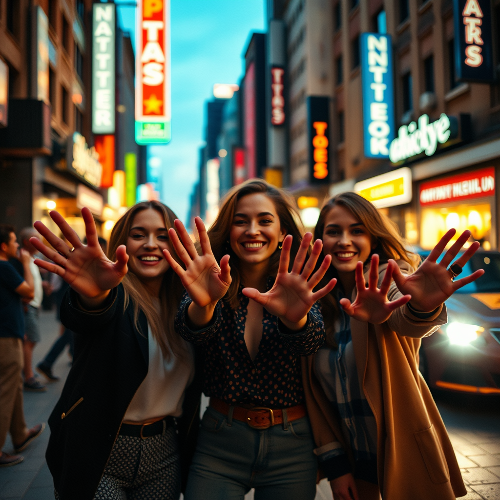 A cinematic photo captures a trio of women on a bustling city street, their hands playfully reaching toward the camera. The vibrant urban backdrop sets the scene, with neon lights softly glowing in the evening air. Each woman exudes a sense of confidence and joy, their expressions lively and engaging as they interact with the lens. The scene is imbued with a sense of spontaneity, with the movement of people and flickering car headlights in the background adding to the dynamic atmosphere.