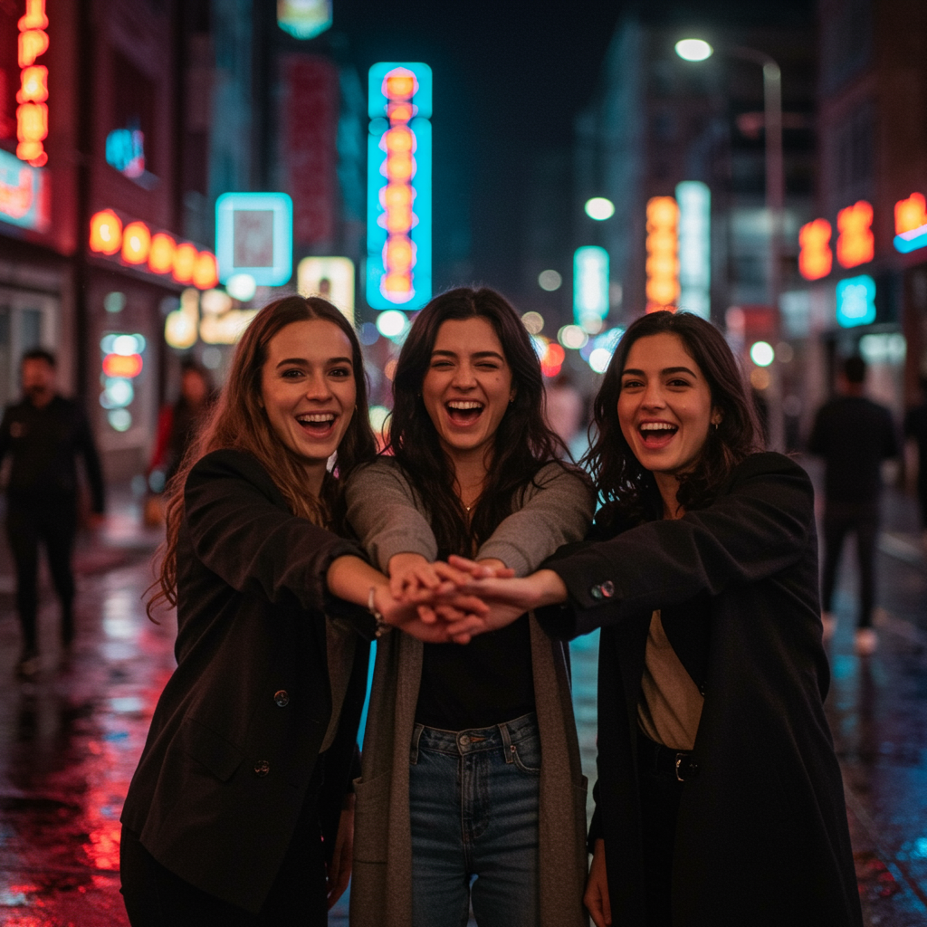 A cinematic photo captures three women standing together on a lively downtown street, their faces lit with jubilant expressions as they extend their hands toward the camera, surrounded by the blur of bustling city life and vibrant neon lights reflecting off wet pavement after a fresh rain.