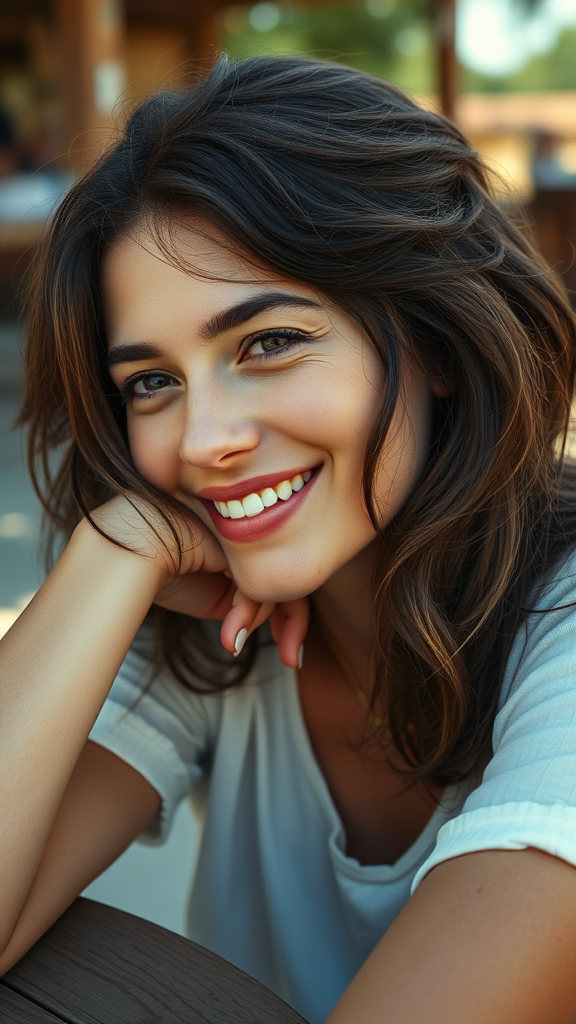 A cinematic photograph captures a woman with untamed brunette hair, resting her head on her hand, appearing serene and content in an outdoor setting. Her natural beauty shines through without makeup as she smiles warmly at the world. The scene is masterfully shot in UHD using 35mm film, utilizing natural light to highlight intricate details and a gentle bokeh effect. The image blends elements of a highly detailed drawing, painting, and sketch with subtle nods to impressionism. The overall atmosphere is slightly noisy and soft-focused, evoking an authentic and intimate moment in time.
