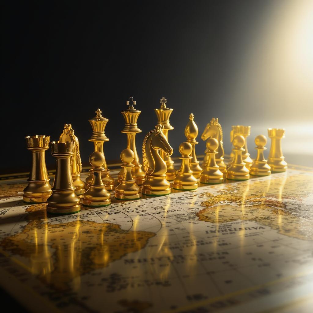 A cinematic photograph captures exquisitely crafted golden chess pieces arranged strategically on a richly detailed board made from vintage world maps, representing global influence, strategic planning, and intellectual prowess. The composition features meticulously designed shadows and soft reflections that add a sense of depth. Set against a sleek, dark-gray background that gradually transitions to a soft, creamy white towards the horizon, the image evokes an aura of sophisticated luxury and refinement. The worn, earthy tones of the maps beautifully contrast with the metallic sheen of the chess pieces, with the overall scene exuding elegance, precision, and the tension of high-stakes intellectual battle. Small creative touches include the addition of tiny, engraved symbols on the chess pieces, hinting at ancient wisdom, and a faint, ethereal glow that seems to emanate from the board itself, further enhancing the sense of intellectual mystique and mastery.
