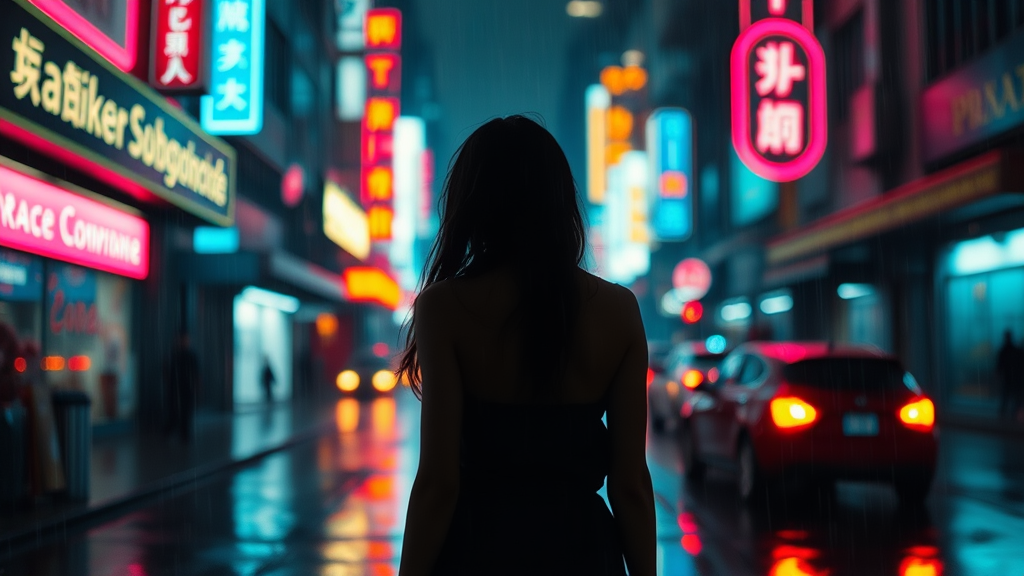 A cinematic photograph capturing a lone woman standing in the rain, silhouetted against vibrant neon lights in a cyberpunk Night City setting. Shot with a Canon EF 50mm f/1.8 STM lens, the scene is set in the year 2077, achieving a hyperrealistic feel with raytracing and a striking depth of field. The image is full of vivid colors and high detail, showcasing rim lighting that highlights the woman's figure. Despite the low resolution, the atmosphere is immersive, with a sense of mystery emphasized by the neon glow. The backdrop is rich in narrative, with blurred cityscape elements adding to the ambiance. This arresting visual encounter blends reality with a futuristic touch, avoiding any distortions or imperfections that could detract from its impact.