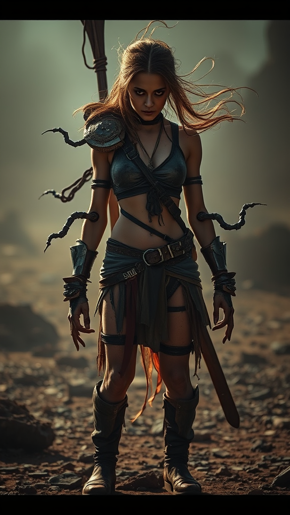A cinematic photograph of a female warrior in a post-apocalyptic landscape, set in a dystopian era. The scene captures dramatic lighting with cinematic noise, creating deep, prominent shadows. The character exhibits poorly realized anatomy, with bizarre mutations such as extra limbs, missing parts, and disconnected or floating elements. The overall image gives an eerie, unsettling feel with its depiction of grotesque and disturbing malformations, emphasizing a world ravaged by chaos and mutation.