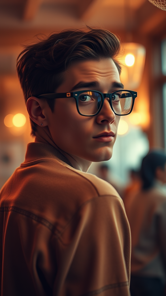 A cinematic photograph of a youthful man sporting glasses, captured mid-motion as he glances back towards the camera. The scene is imbued with a Wes Anderson-inspired color palette, exuding a sense of coziness and warmth. The lighting is intricately detailed and cinematic, evoking a timeless, whimsical atmosphere reminiscent of Moonrise Kingdom, with creative nuances that add depth to the composition.