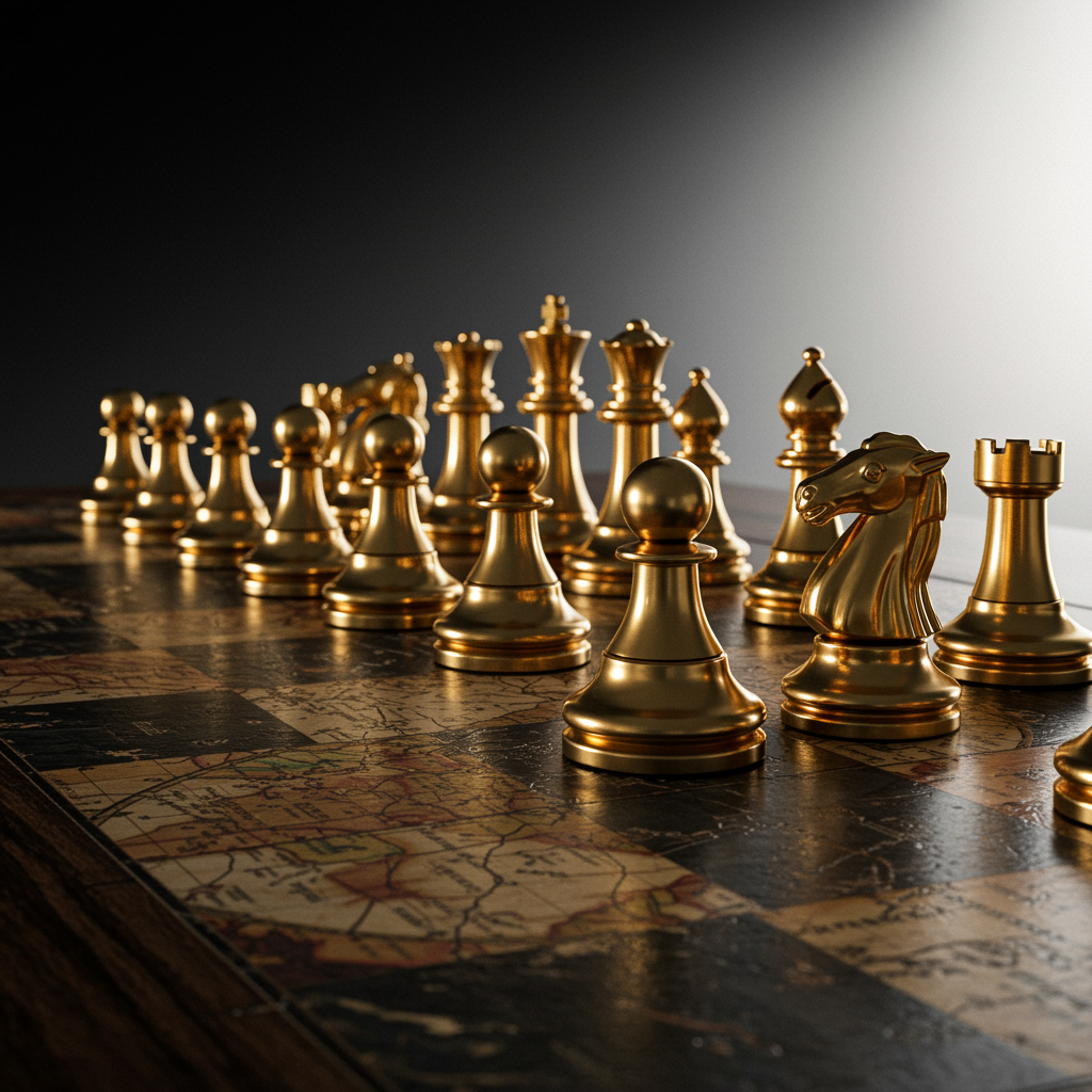 A cinematic photograph of elegantly crafted golden chess pieces meticulously arranged on a richly textured board, composed of vintage world maps, symbolizing global influence, strategic planning, and intellectual prowess. The scene is enhanced by carefully designed shadows and delicate reflections, creating a sense of depth. The background is a sleek, dark-gray that gradually transitions to a soft, creamy white, evoking an air of sophisticated luxury and refinement. The worn, earthy tones of the maps contrast beautifully with the metallic sheen of the chess pieces, conveying a sense of elegance, precision, and high-stakes intellectual challenge, with small creative nuances enriching the visual narrative.