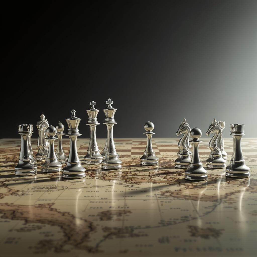 A cinematic photograph of intricately designed platinum chess pieces strategically positioned on a richly textured board composed of ancient nautical charts, symbolizing global influence, strategic planning, and intellectual mastery. The composition features carefully crafted shadows and subtle reflections, creating a profound sense of depth. It is set against a sleek, charcoal-gray background that gradually transitions to a soft, ivory hue towards the horizon, evoking an aura of sophisticated luxury and refinement. The maps' weathered, earthy tones and the chess pieces' metallic sheen create a stunning juxtaposition, with the overall composition exuding elegance, precision, and high-stakes intellectual combat.