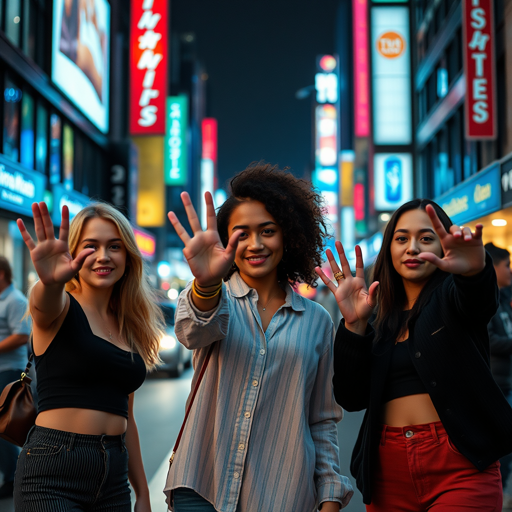 A cinematic photograph of three women standing on a bustling city street, each with one hand raised towards the camera, capturing a moment of energy and spontaneity, vibrant city lights reflecting in their eyes and creating a backdrop of urban life and excitement.
