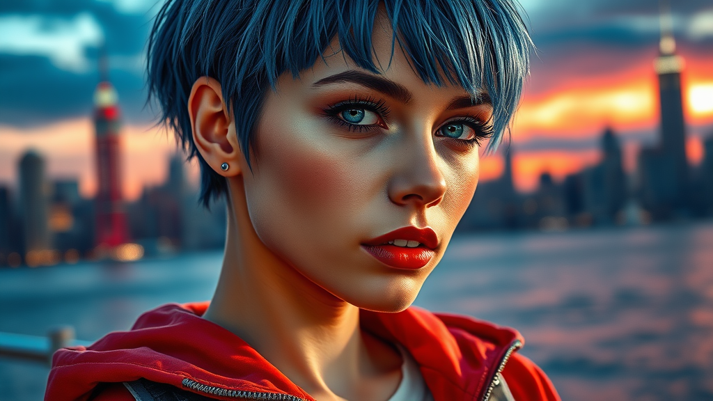 A cinematic, photorealistic face portrait of a girl with features reminiscent of Grace Kelly and Kristen Stewart, wearing a cyberpunk-inspired outfit. She has short, sparkly blue hair and a fit physique. Her attire includes a red sports jacket, complemented by striking blue makeup. The scene is set against the vibrant backdrop of the New York coastline, with HDR colors enhancing the image. The lighting is cinematic, adding depth and drama to the portrait.