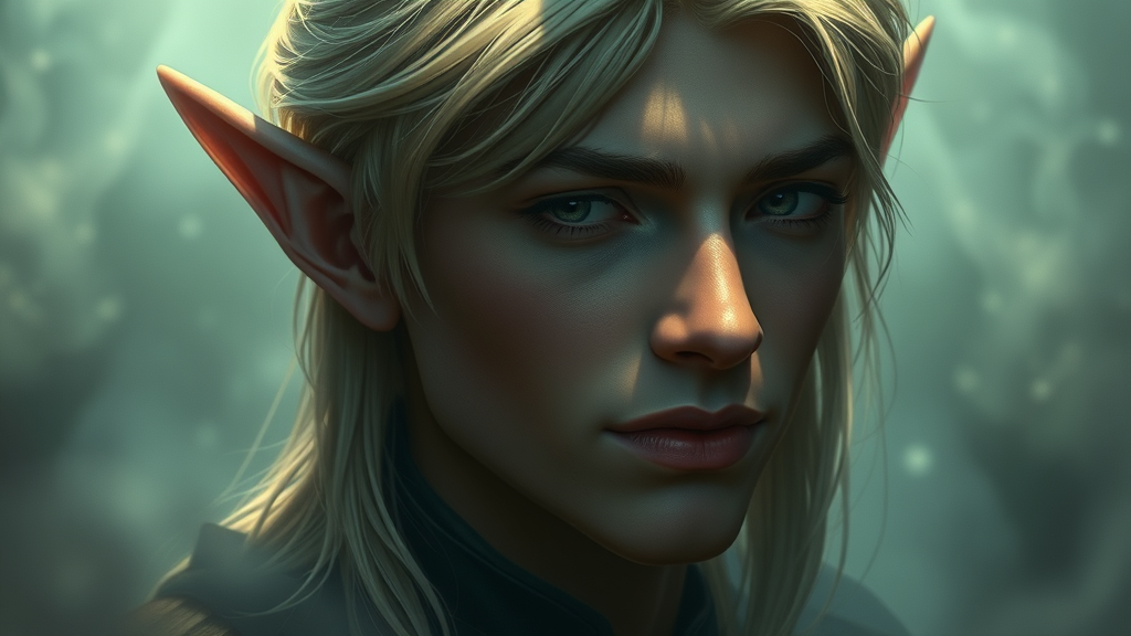 A cinematic, photorealistic portrait of a male elf set in a mysterious fog, illuminated by intricate and volumetric lighting that casts elegant shadows. The artwork showcases ornate and highly detailed features, with a smooth, sharp focus that highlights the elf's graceful and striking appearance. Inspired by the styles of Artgerm, Greg Rutkowski, and Alphonse Mucha, this digital painting captures an essence of sophistication and fantasy. The composition avoids imperfections, maintaining a seamless integration of elements, ensuring the elf's refined features and the surrounding mist are in perfect harmony.