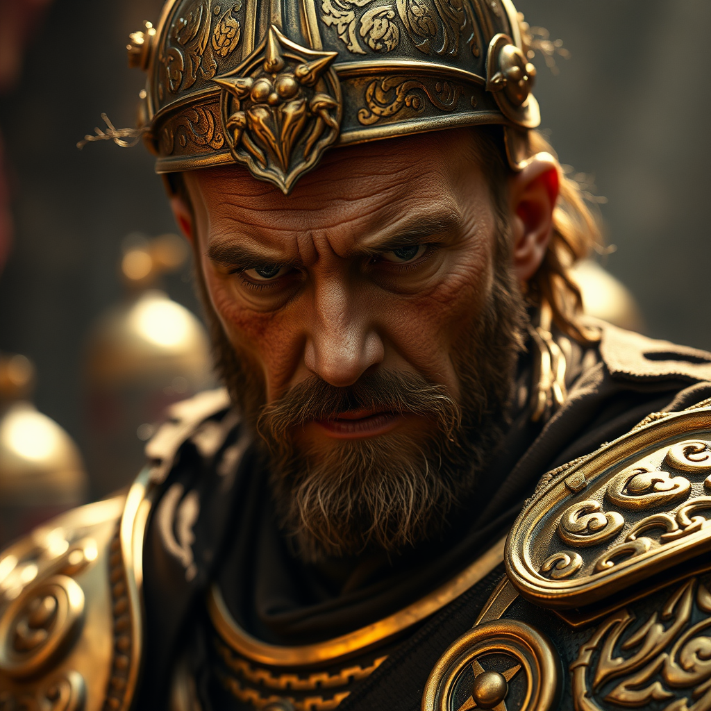 A cinematic portrait captures a weary warrior clad in intricate golden armor, his clear facial features etched with the fatigue and resolve of an arduous war. The focus is sharp and intimate, using a 35mm lens set to f/1.8, which beautifully blurs the background. Accent lighting softly highlights the contours of his face and armor, creating a play of shadows that speaks to his inner turmoil. The scene is enveloped in a warm glow of global illumination, imbuing the image with a sense of both grandeur and vulnerability, capturing the essence of a hero who stands at the crossroads of triumph and exhaustion.