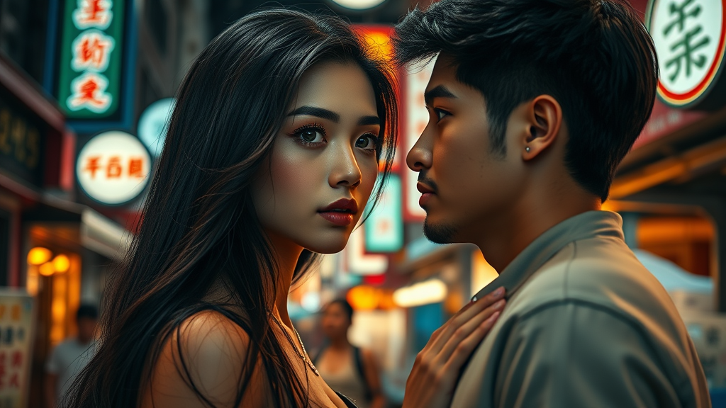 A cinematic portrait capturing a stunning young couple in a bustling Asian market at night, bathed in vibrant neon lights and city glow. The girl, with her long, flowing, ink-black hair and piercing green eyes, gazes intently at the boy. Her face is perfectly symmetrical, adorned with delicate freckles and high cheekbones. She exudes an ethereal beauty with her doe-like, expressive eyes and soft, precise makeup. Her figure is impeccably fit, showcasing long, elegant legs. The boy, equally captivating, holds her gaze with a look of deep understanding. The background is alive with the warmth of shop signs and the mystery of the city nightscape, creating a dreamlike atmosphere. Shot with an aperture of 1.8, the image features bokeh and lens flare, heightening the romantic and slightly melancholy mood. The scene is rendered in ultra HD and HDR, capturing every micro-detail in 8K resolution, giving an almost extradimensional quality to the enchanting encounter.