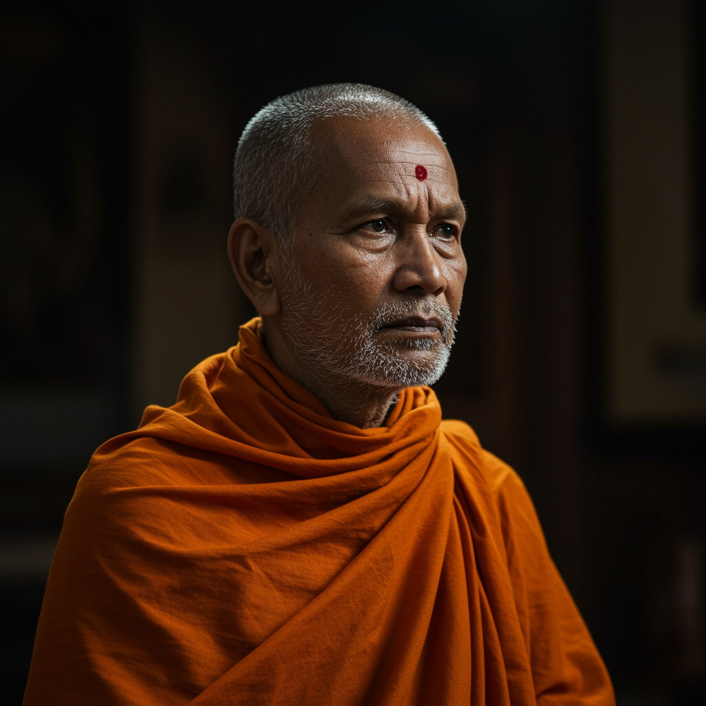 A cinematic portrait of a 58-year-old monk with a contemplative gaze, dressed in vibrant orange robes. The photograph captures the essence of timeless wisdom and serenity, illuminated by hard edge lighting to emphasize his facial features. The scene draws inspiration from the profound presence of thinkers like Rupert Spira, Ramana Maharshi, and Joan Tollifson, highlighting serious, introspective eyes. Shot with precise 50mm portrait photography, the image presents a harmonious blend of spirituality and human depth, with the monk looking thoughtfully away from the camera.