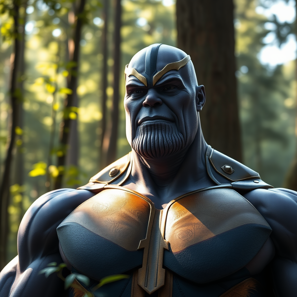 A cinematic portrait of a friendly Thanos in a lush forest in Himachal Pradesh, capturing his clear facial features, broad chest, and toned physique. Shot with a 20mm lens at f/1.8, the scene features accent lighting and global illumination to highlight his presence. The atmosphere is serene yet majestic, blending the natural beauty of the forest with the imposing yet gentle demeanor of Thanos. His expression is calm and wise, surrounded by the dappled sunlight filtering through the trees, casting a warm, inviting glow.