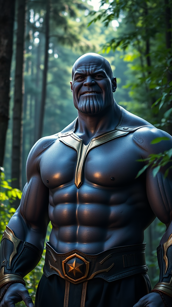 A cinematic portrait of a friendly Thanos standing amidst the lush forests of Himachal Pradesh, featuring clear facial features and a robust, toned physique. The scene is captured with a 20mm lens at f/1.8, utilizing accent lighting and global illumination to highlight his presence. Soft uplighting enhances the atmosphere, with the forest's vibrant greenery serving as a dramatic backdrop, creating a sense of harmony between the powerful figure and the serene natural surroundings, all composed in a 16:9 aspect ratio.