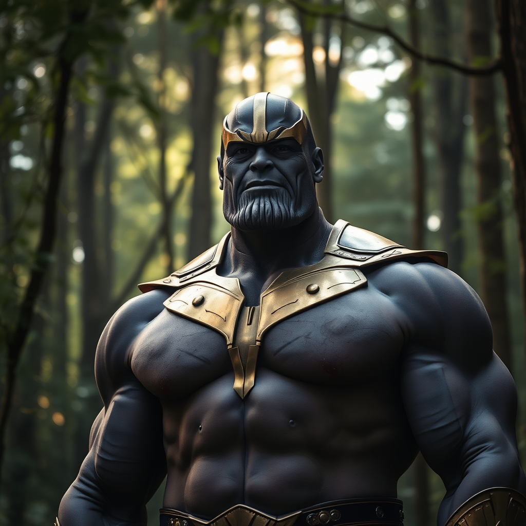 A cinematic portrait of a friendly Thanos standing majestically in a lush forest in Himachal Pradesh, highlighting his clear facial features, broad chest, and toned physique. Shot with a 20mm lens at f/1.8, the composition features accent lighting and global illumination, emphasizing an ethereal glow through the forest canopy. The scene conveys an inviting and mythical presence, encapsulating the serene beauty and mystery of the woodland environment.