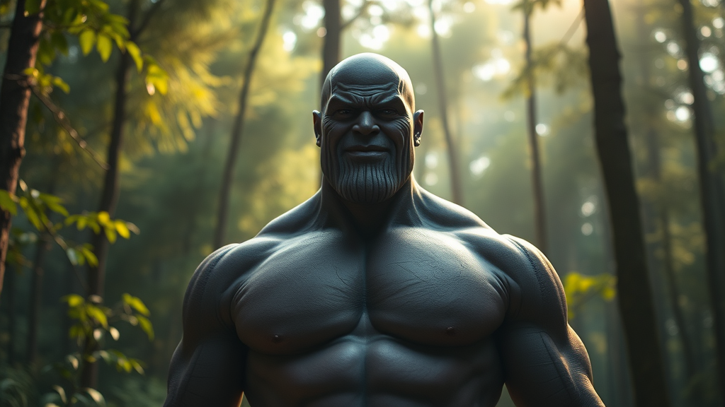 A cinematic portrait of a friendly Thanos with clear facial features, standing in a vibrant forest in Himachal Pradesh. He has a big chest and a toned body, captured with a 20mm lens at f/1.8. The scene is enhanced by accent lighting and global illumination with uplight, creating a dramatic yet warm atmosphere in a 16:9 aspect ratio. The forest around him is lush and detailed, adding to the serene and majestic ambiance.