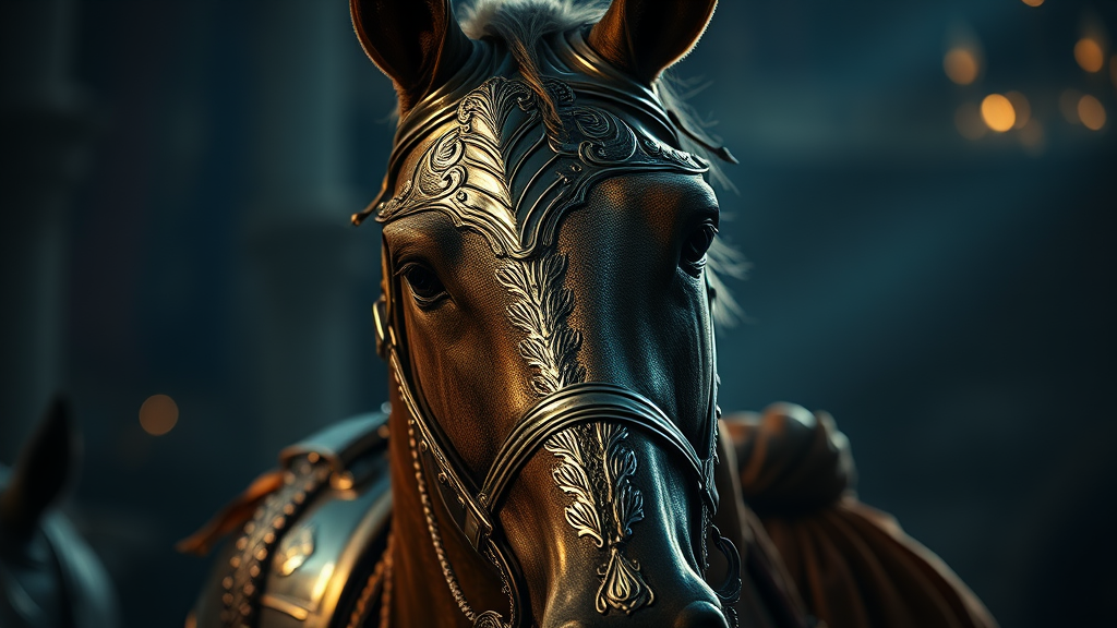 A cinematic portrait of a horse knight adorned in finely detailed armor, featuring intricate silver designs and accents of luxurious silk, illuminated by dramatic and atmospheric lighting, captured in stunning 4k detail.