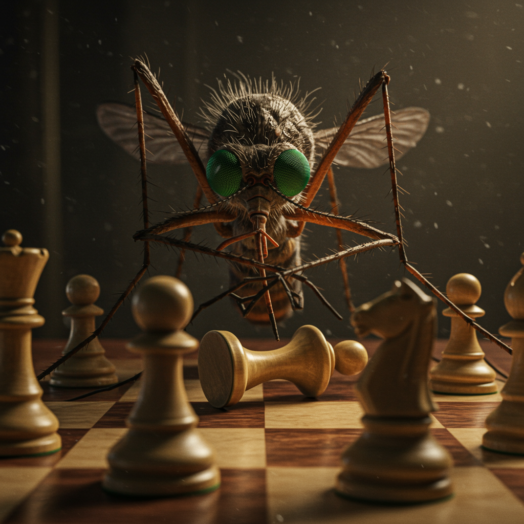 A cinematic portrait of a mosquito with big green eyes, intricately detailed and wearing elaborate armor, sits poised at a chessboard, its delicate legs carefully positioned over the chess pieces. The scene is filled with rich textures and a sense of intensity, capturing the mosquito’s concentrated gaze and the lush details of the surroundings. The lighting is dramatic, casting soft shadows that enhance the atmosphere of this surreal moment.