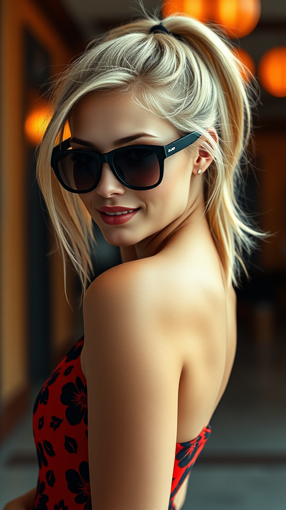 A cinematic portrait of a stunning girl with medium length blonde hair, tied in a ponytail, posing gracefully in a full body frame. She wears sleek black sunglasses and a vibrant red and black flowery mini dress, her toned figure exuding elegance. Her face is turned towards the viewer, showcasing a friendly demeanor with beautifully intricate and highly detailed features, reminiscent of the artwork by Greg Rutkowski and Magali Villanueve. The scene is captured in high detail RAW color art, with vibrant hues and sharp focus. The setting, with its hyperrealism and epic movie poster feel, is enhanced by dramatic and cinematic lighting. Her striking eyes and flawless complexion contribute to this masterpiece of hyperrealistic photography, capturing the essence of beauty and sophistication.