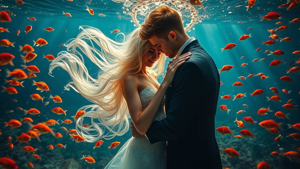 A cinematic portrait of a stunning mermaid bride tenderly embracing her groom, surrounded by a shimmering halo of tiny goldfish amidst vibrant marine life. Her luxurious flowing hair dances in the gentle underwater currents, framing their touching underwater wedding ceremony. Subtle beams of light filter through the water, casting a soft, romantic glow. Captured with 35mm clarity, F/2.8, and a distinct vignette, the scene boasts intricate detailing and ornate elegance, brought to life with spotlight-enhanced cinematic lighting in ultra-high definition. A breathtaking tableau of love and harmony beneath the waves.