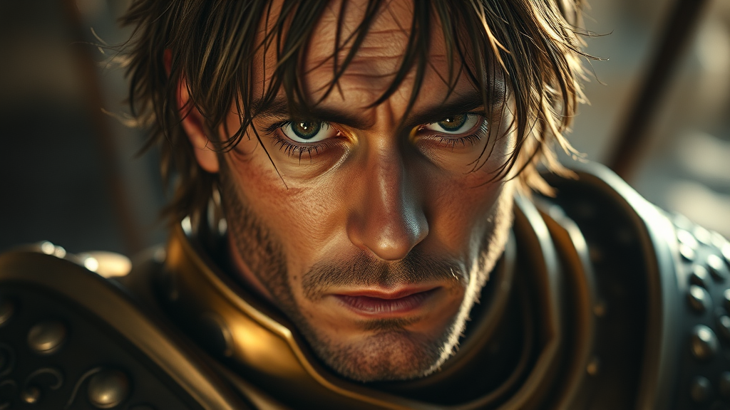 A cinematic portrait of a weary warrior dressed in golden armor, his face etched with exhaustion from a long and grueling war, captured with a 35mm lens at f/1.8. His clear facial features are highlighted by accent lighting, enhanced by global illumination, revealing traces of battle-worn resilience and a hint of somber reflection. Subtle details like a faint scar on his cheek and disheveled hair add depth to his expression, as the soft light glimmers off the ornate engravings of his armor, painting a picture of strength and vulnerability intertwined.