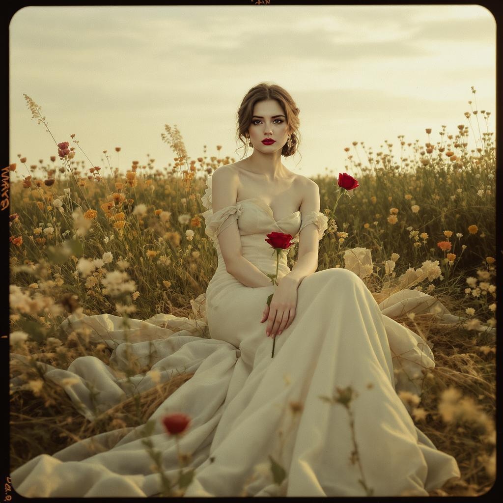 A cinematic portrait of a woman in an elegant dress, seated gracefully in a lush field of wildflowers. She gently holds a rose, her face depicted with intricate and realistic detail, exuding symmetry and beauty. Despite being a low-resolution depiction, the artwork captures the essence of her serene expression. The background is slightly blurred to enhance focus on her, while the scene retains an organic, natural feel, albeit with some visible textures and minor imperfections that lend a touch of character to the artwork.