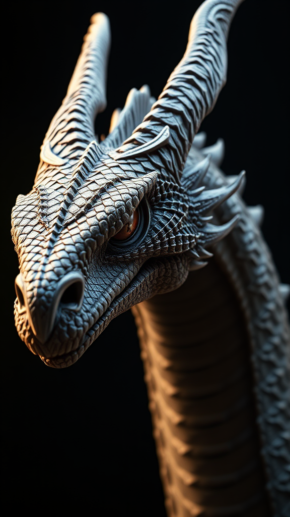 A cinematic portrait of an elegant, sleek female dragon, captured in hyper-realistic 3D detail, reminiscent of a movie still. The dragon's features are finely crafted, showcasing intricate textures and lifelike realism achievable through advanced tools like Maya and ZBrush. This head shot embodies the grace and power of the creature, rendered in stunning 4K HD resolution. The dragon's scales and features are depicted in exquisite detail, highlighting her regal presence without any background distractions. The lighting and shading emulate a realistic animation style, setting a dramatic, immersive scene in a 9:16 aspect ratio.